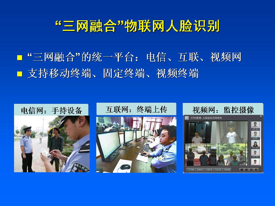 其典型应用包括面向公共安全的物联网“三网合一”人脸识别系统平台(针对“人”类型的视觉标签),其中“三网合一”融合电信、互联、视频网,它支持移动终 端、固定终端、视频终端的视觉或图像设备,反恐身份识别,电子商务,身份管理。在智能交通领域的应用(针对“车”类型的视觉标签)包括:车辆规 章管理,等。未来发展的更高境界是智能视觉物联网综合应用系统平台。